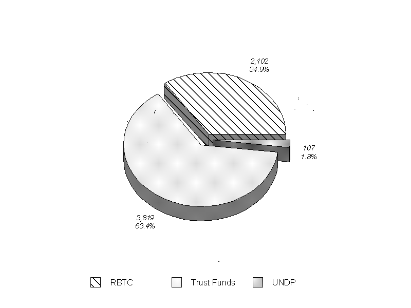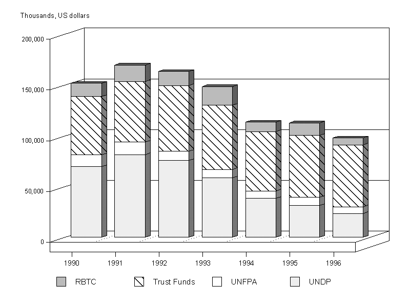 8. Chart 1 and Appendix I(A) show that the share of the trust fund and multi- bilateral programmes increased further, rising to 62 per cent in 1996 from 54 per cent in the previous year. The UNDP-financed programme contracted to 24 per cent, from 27.6 per cent in 1995; UNFPA expenditure fell by about 20 per cent, while there was an even sharper drop of 44 per cent in RBTC expenditure. This derived from delays in allocating initial RBTC resources on account of the uncertain financial situation at the time. The need for caution led to a two-stage release of resources for the 1996-97 biennium.
