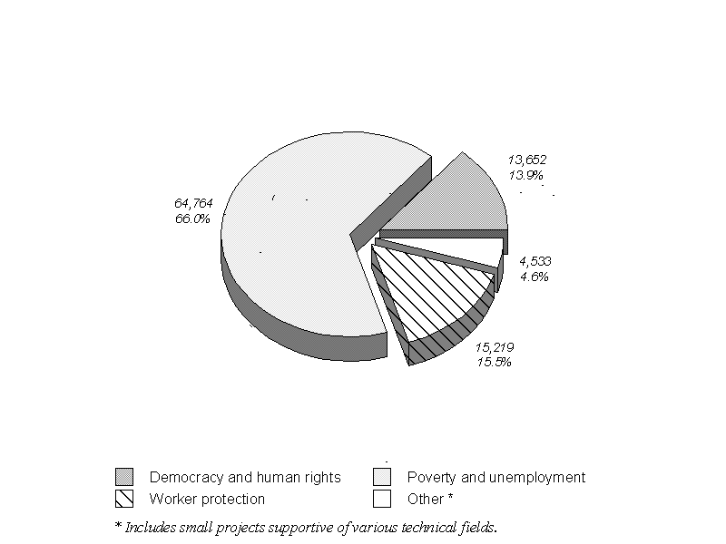 16. The priorities for ILO activities in the current biennium, employment promotion, democracy and human rights, and worker protection, provided the reference points for the substantive content of the technical cooperation programme. If programme expenditure in the main ILO technical fields is categorized under one of these priorities as an approximate indication of the relative distribution of expenditure on each theme, it would show that about 66 per cent of expenditure was associated with employment promotion and poverty alleviation,(1) 16 per cent with worker protection programmes, and 14 per cent with democracy and human rights programmes.(2) This is illustrated in chart 10.(3) It must be emphasized that this can only be a rough indicator.