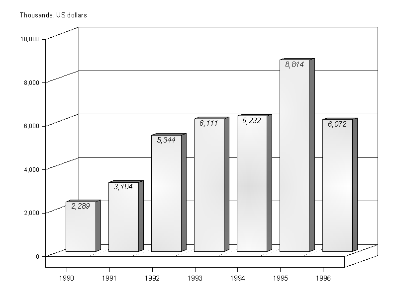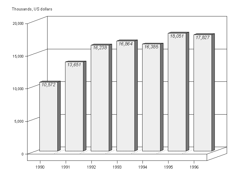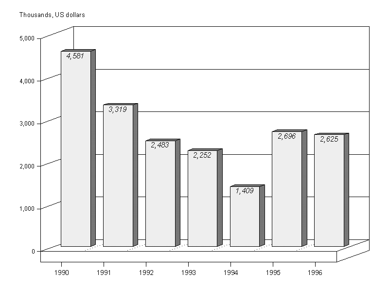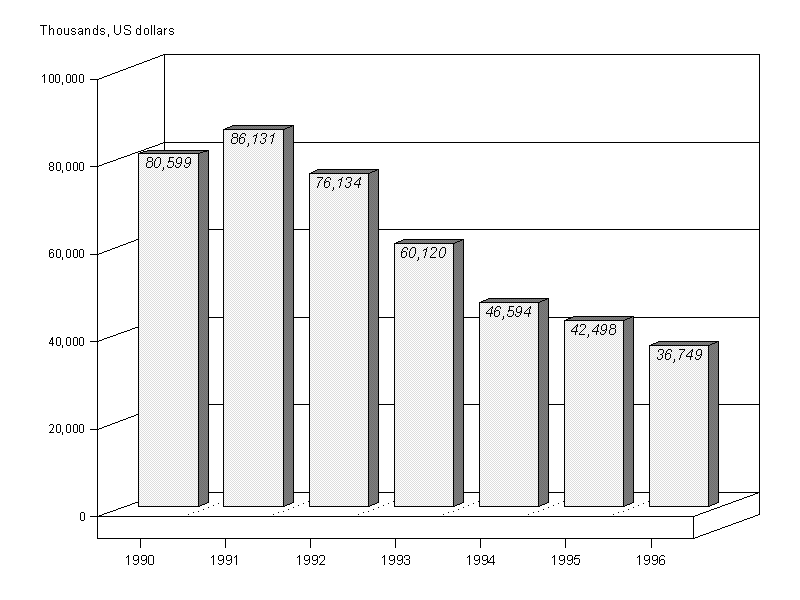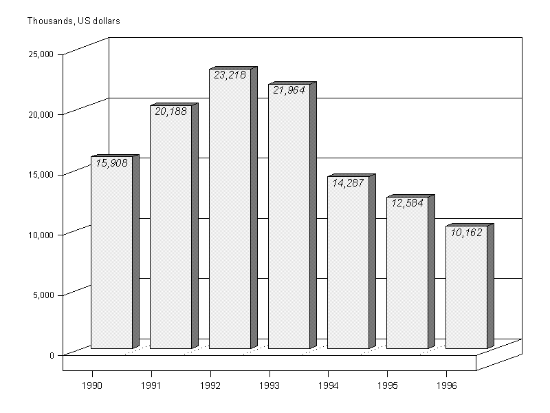 12. Approvals peaked at $165.6 million in 1990. After a four-year decline between 1991 and 1994 the approval level rose to $114 million in 1995, and this level was sustained in 1996. The stabilization of approval levels in the last two years should have a positive impact on expenditure in 1997-98. It should be noted that nearly 32 per cent of new approvals in 1996 were for the IPEC programme, the largest being the German contribution of $33.8 million.