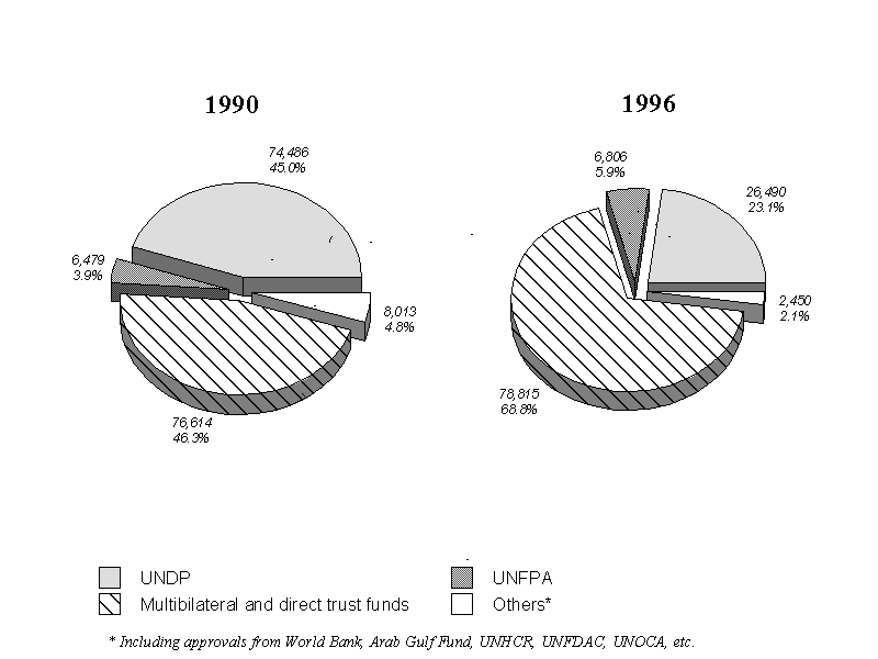 13. As illustrated in chart 9, the composition of approvals changed over the period 1990-96: in 1990, the UNDP and UNFPA together accounted for nearly 50 per cent of approvals, but by 1996 their share had dropped to about 29 per cent, with trust funds and the multi-bilateral programme accounting for the balance. Changes in the modalities of cooperation and a tendency for the UN funding agencies to become more involved in the substantive and operational activities, rather than using the specialized agencies, contributed to the changing pattern.