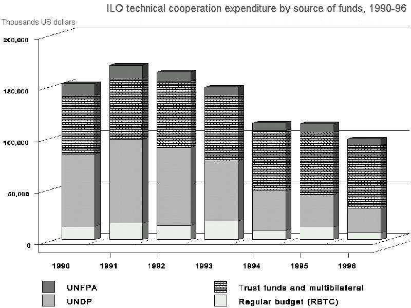 18. In 1990, the UNDP and UNFPA shares of total ILO technical cooperation expenditure stood at 45.9 per cent and 7.6 per cent respectively. By 1996 the combined expenditure on these two programmes represented 30.7 per cent of total expenditure. On the other hand, the share of trust fund programmes rose from 37.8 per cent in 1990 to 62.2 per cent in 1996. These trends are reflected in Figure 2. Within the trust fund programmes, multibilateral technical cooperation expenditure (excluding expenditure on the Associate Expert Programme) rose from about $40 million in 1990 to about $52 million in 1996. A decade ago, approximately a dozen countries participated in the ILO's multibilateral programme; today the ILO has over 20 multibilateral contributors as well as a wider range of UN and non-UN partner organizations. Within the multibilateral programme four countries (Germany, Denmark, Norway and the Netherlands) regularly account for some 70 per cent of annual expenditure.