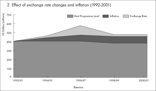 4. The rate of exchange assumed for budgetary purposes between the United States dollar and the Swiss franc was of particular importance for organizations whose budgets were denominated in dollars and whose expenditures were incurred to a significant extent in Swiss francs. However, the rate also had importance for organizations whose budgets were denominated in Swiss francs, since it affected the Swiss-franc equivalent of estimates for dollar income and expenditure, such as expected receipts of support-cost income in dollars from extra budgetary sources, requirements for activities in which costs were incurred in dollars, and contributions to the United Nations Joint Staff Pension Fund, which were calculated in dollars.