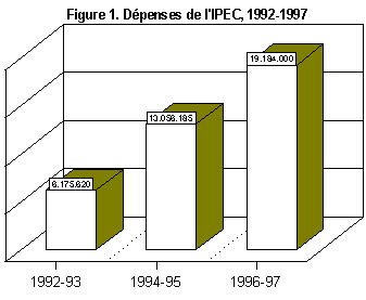 8. Le total des dépenses du programme avait atteint environ 38,5 millions de dollars à la fin de 1997. Ce chiffre doit être comparé au total de 43 millions de dollars versé par les donateurs durant la période 1992-1997, dont une part considérable n'a été reçue que vers la fin de 1997. La figure 1 ci-dessous montre que les dépenses ont doublé entre la période biennale 1992-93 et la période biennale 1994-95 et qu'elles ont encore augmenté de près de 50 pour cent au cours de la période biennale 1996-97. Les ressources du budget ordinaire de l'OIT affectées à la lutte contre le travail des enfants ont augmenté parallèlement à la forte progression des ressources extrabudgétaires reçues dans ce domaine. Encore qu'il soit difficile de donner un chiffre précis, on peut estimer que le budget ordinaire de 1998-99 comprend quelque 6,2 millions de dollars en faveur des activités liées au travail des enfants dans les départements régionaux et dans ceux du siège. Ce chiffre représente une augmentation de 2,7 millions de dollars par rapport au montant de 1996-97, augmentation due essentiellement au fait que les départements intéressés affectent une proportion accrue de leur personnel aux activités relatives à l'abolition du travail des enfants. Au cours de la période biennale 1996-97, le Département des conditions et du milieu de travail a affecté un montant de ressources considérable aux activités et séminaires régionaux demandés par les mandants et a participé activement à l'organisation de plusieurs conférences internationales sur le travail des enfants.