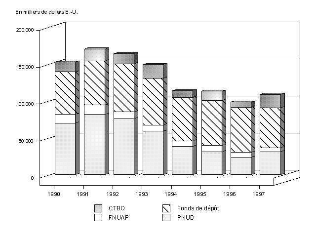 10. L'année 1997 a mis un terme à cinq années de baisse des dépenses engagées au titre du programme de coopération technique de l'OIT. Ces dépenses sont ainsi passées de 98,2 millions de dollars en 1996 à 108,4 millions en 1997, soit une augmentation de 10,4 pour cent. Toutefois, le taux d'exécution a chuté au cours de la même période, passant de 62 à 55 pour cent. Les causes de cette forte baisse sont analysées en détail dans la partie VII. Comme indiqué dans l'annexe II, les dépenses de personnel ont baissé de 1,9 pour cent, alors que les autres postes ont augmenté de façon considérable par rapport à 1996, notamment la formation (+39,5 pour cent) et le matériel (+54,4 pour cent). On trouvera à l'annexe IV la répartition des dépenses par pays, par région et par source de financement.