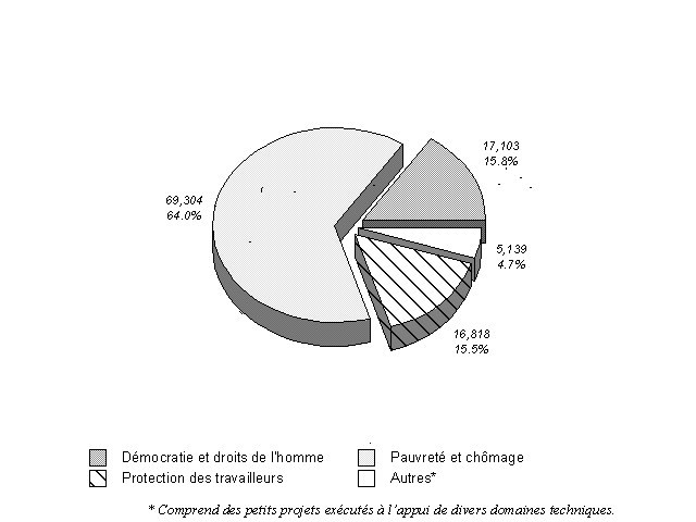 17. Les grandes priorités de l'OIT au cours de la présente période biennale (promotion de l'emploi, démocratie, droits de l'homme et protection des travailleurs) ont continué de déterminer le contenu du programme de coopération technique de l'Organisation au cours de la période considérée. Sur le montant total des ressources affectées aux thèmes prioritaires, 64 pour cent ont été consacrés à la lutte contre la pauvreté et à la création d'emplois, 15,8 pour cent à la démocratie et aux droits de l'homme, 15,5 pour cent à la protection des travailleurs et 5 pour cent aux autres programmes (voir la figure 10).