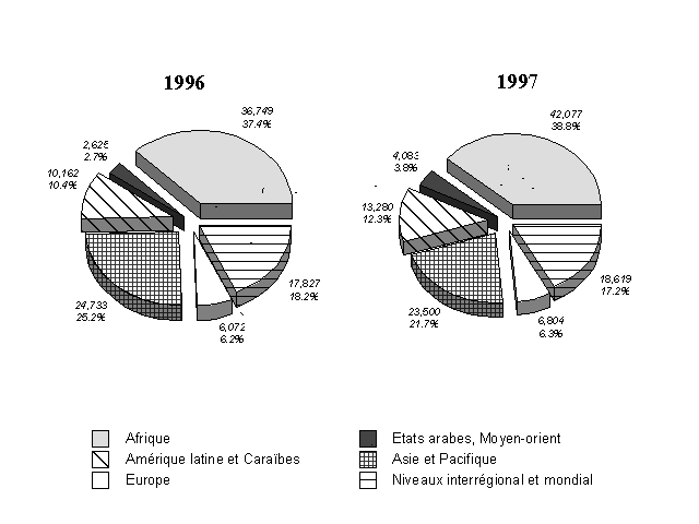 12. Dans toutes les régions, à l'exception de l'Asie et du Pacifique, les dépenses ont augmenté entre 1996 et 1997 (figure 2). Les régions Afrique et Europe ont vu leurs crédits augmenter respectivement de 14 et 12 pour cent (figures 3 et 7), l'Amérique latine et les Caraïbes de 31 pour cent (figure 5), et les Etats arabes (figure 6) de près de 56 pour cent. Les dépenses ont baissé de 5 pour cent par rapport à l'année 1996 dans la région Asie et Pacifique. La région Afrique a continué de représenter la plus grande part des dépenses totales (39 pour cent), suivie (figure 4) par la région Asie et Pacifique (22 pour cent). La part des programmes interrégionaux (figure 8) a augmenté de près de 5 pour cent, dépassant ainsi son niveau record de 1995. La répartition géographique des dépenses est donnée à l'annexe I-B pour la période 1995-97.
