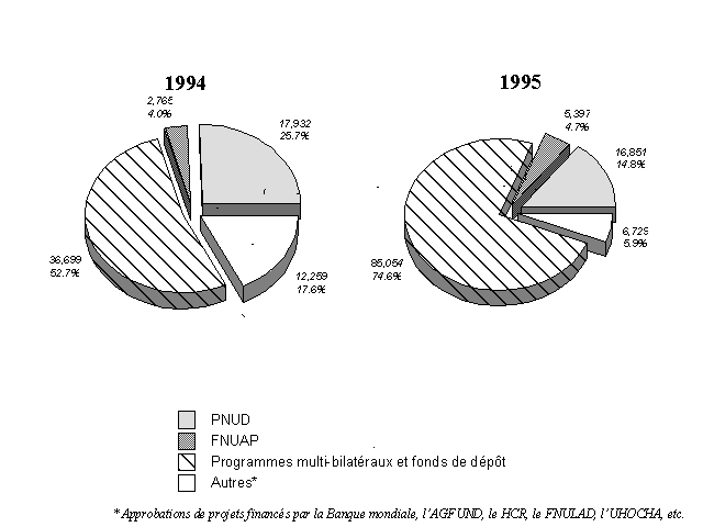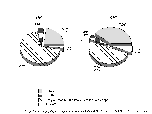14. Le montant des nouvelles approbations de projets financés par le PNUD a doublé, passant de 17,9 millions de dollars en 1996 à 35,8 millions en 1997. L'Afrique a reçu près de 67 pour cent de ces nouvelles ressources. Les révisions de projets financés par le PNUD ont à nouveau augmenté, passant de 8,6 millions de dollars en 1996 à 12 millions de dollars en 1997. Les approbations par les banques de développement ont augmenté de manière considérable, passant de 1,7 million à 5,9 millions de dollars au cours de la même période. Parmi les autres approbations, on peut citer celles du Fonds d'équipement des Nations Unies (1,4 million de dollars).