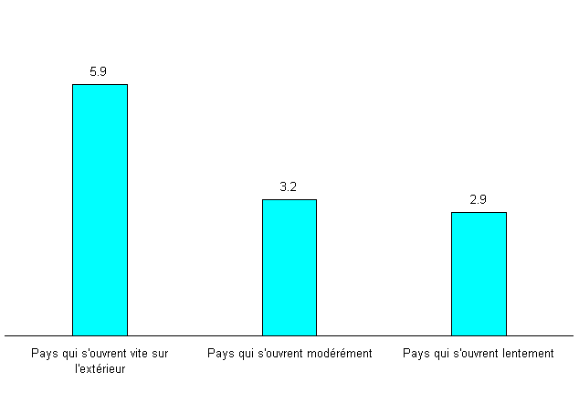 Les chiffres représentent le nombre des travailleurs qui se déplacent entre les secteurs manufacturiers (au niveau CITI à trois chiffres) par emploi créé dans l'ensemble du secteur manufacturier de 77 pays. Plus le chiffre est haut, plus l'incidence des flux d'emploi intersectoriels nets est élevée. Les pays sont répartis en trois groupes. Le premier comprend ceux où le ratio commerce/PIB progresse nettement plus vite que la moyenne; le deuxième ceux où l'évolution de ce ratio est proche de la moyenne internationale; le troisième, les pays où il progresse moins vite que la moyenne (voir le texte pour plus de détails). |