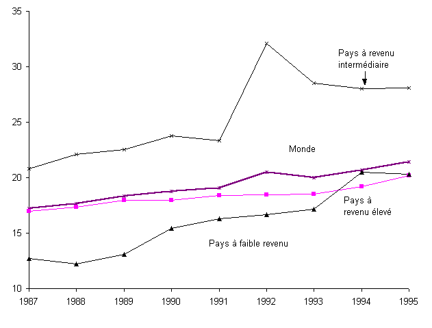 19. La figure 1.A montre que les exportations mondiales considérées en tant que part du PIB mondial à prix courants ont enregistré une augmentation rapide du milieu des années soixante au milieu des années soixante-dix, ont connu une période de stagnation entre le milieu des années soixante-dix et le milieu des années quatre-vingt, puis ont repris une nette orientation en hausse. Aujourd'hui, les exportations mondiales représentent près d'un cinquième du PIB mondial, soit 5 pour cent de plus qu'au milieu des années quatre-vingt. A prix constants, l'accroissement est bien plus marqué, ce qui s'explique par le fait que, en moyenne, les prix à l'exportation ont progressé plus lentement que les prix des biens et services produits sur place (figure 1.B). La hausse récente du rapport exportations-PIB a été beaucoup plus forte dans les pays à revenu faible et intermédiaire que dans les pays à revenu élevé (figure 2).