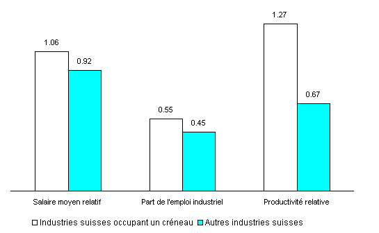 1Industries occupant un créneau: produits différenciés (produits alimentaires, boissons et tabac, produits chimiques, machines et électronique, montres et bijouterie). Autres industries: faible différenciation des produits (textile, vêtement, bois, papier, impression, cuir et chaussures, produits en caoutchouc et en plastique, minerais non métalliques, métaux, autres produits manufacturés). |