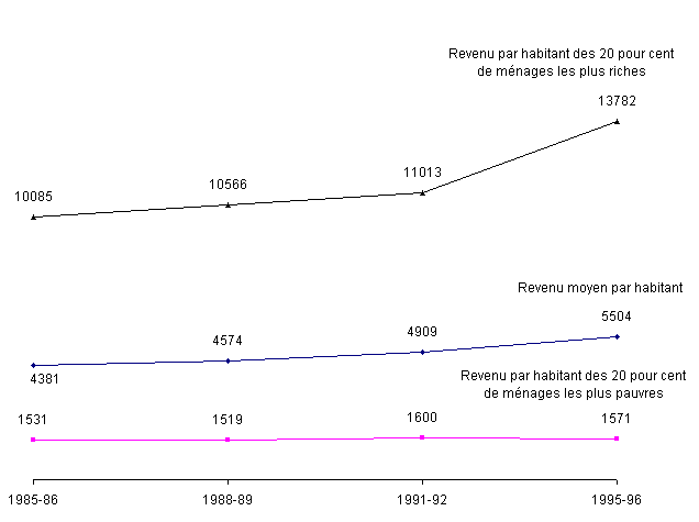 Malheureusement, la libéralisation des échanges et le processus de croissance concomitant se sont aussi accompagnés d'une augmentation des inégalités. On estime effectivement que le revenu réel moyen de 20 pour cent des ménages les plus pauvres a pratiquement stagné depuis les années 1989-90, tandis que le niveau de vie de 20 pour cent des ménages les plus riches a fait un bond en avant: le revenu moyen par habitant de ces ménages a augmenté de plus de 30 pour cent. On peut expliquer ainsi pourquoi les taux de pauvreté et l'incidence du travail des enfants n'ont pas beaucoup diminué. Le développement a également été inégal entre les zones urbaines et rurales. Des poches de développement autour de la capitale et des deux ZFE ont bénéficié d'un environnement économique dynamique comparé au reste du pays. Selon un cadre conceptuel mis au point pour les besoins de l'étude, les tendances vers de plus grandes inégalités peuvent s'expliquer par le fait que les effets stimulants de la libéralisation des échanges ont opéré dans un contexte d'économie «duale», soit une économie où les secteurs rural et urbain suivent des voies de développement indépendantes.
