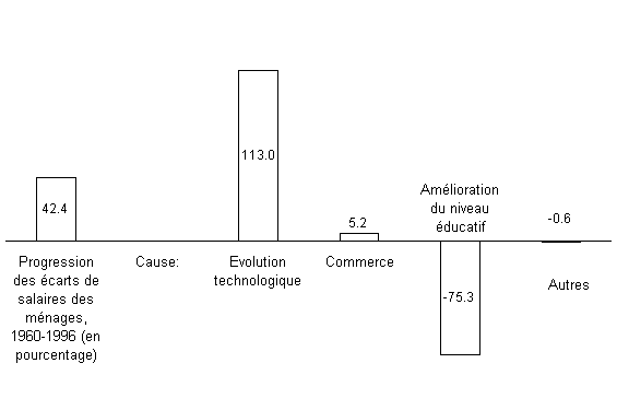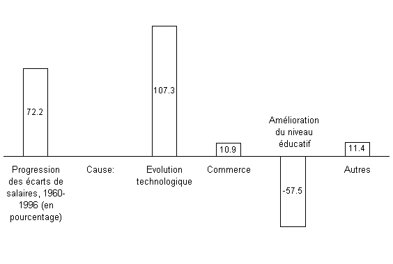 Mis à part le commerce, l'amélioration du niveau d'instruction a sans aucun doute renforcé la productivité des travailleurs. L'éducation a toujours été au premier rang des priorités en Corée. L'accès à l'enseignement secondaire a été généralisé dans les années soixante et au début des années soixante-dix, et depuis lors de gros efforts ont été faits dans le domaine de l'enseignement supérieur. Ainsi, en 1995, près de 60 pour cent des jeunes suivaient des études supérieures, contre 9 pour cent seulement en 1970. Un cinquième de la population coréenne âgée de plus de 25 ans est titulaire d'un diplôme de l'enseignement supérieur. Ces efforts ont eu pour effet que la Corée a dépassé plusieurs pays développés pour ce qui est du niveau d'instruction. L'étude montre que l'éducation a contribué à atténuer les facteurs d'inégalité des marchés de l'emploi qui sont généralement associés à la mondialisation. L'évolution technologique apparaît comme une source importante d'inégalités, tandis que le commerce a joué un rôle relativement mineur et que l'éducation a atténué les deux facteurs.