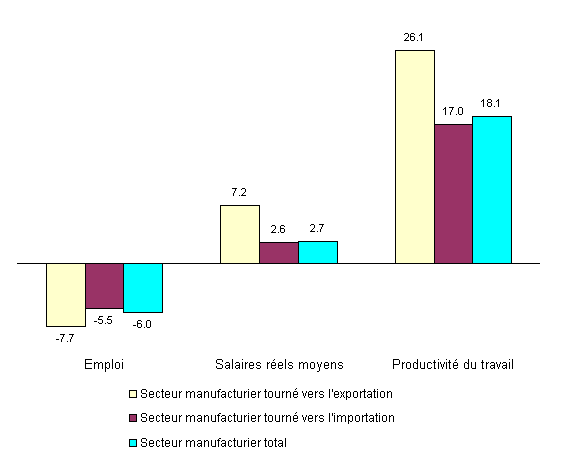 L'avantage comparatif révélé est le ratio des flux commerciaux nets par rapport au commerce total (importations plus exportations). Les secteurs manufacturiers ayant bénéficié d'un avantage comparatif révélé positif en 1997 ont été placés dans la catégorie «tourné vers l'exportation», tandis que ceux ayant un avantage négatif ont été placés dans la catégorie «en concurrence avec les importations». |