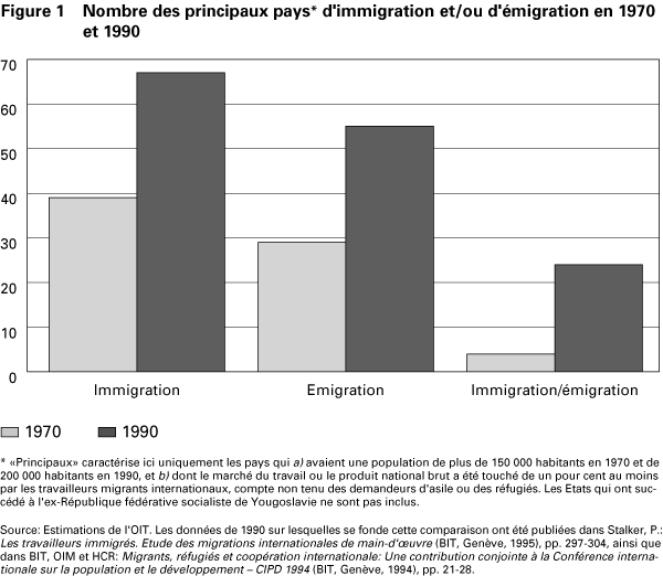 7. Le nombre total d'individus impliqués dans le processus de migration a augmenté mais également le nombre de pays d'origine des travailleurs migrants et de pays de destination. En 1970, les principaux pays d'accueil ou de départ de travailleurs migrants étaient au nombre de 64; en 1990, ils étaient plus d'une centaine si l'on prend en compte la dissolution de l'ancienne Union soviétique et de la Yougoslavie(6). L'Italie, le Japon, la Malaisie et le Venezuela sont désormais d'importants pays d'accueil tandis que le Bangladesh, l'Egypte et l'Indonésie font partie des principaux pays de départ(7). La figure 1 qui suit montre l'augmentation du nombre de pays concernés par les migrations internationales en tant que pays de départ ou d'accueil ou, dans bien des cas, des deux à la fois.