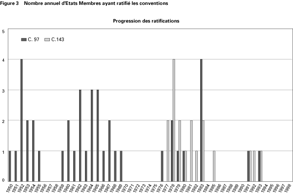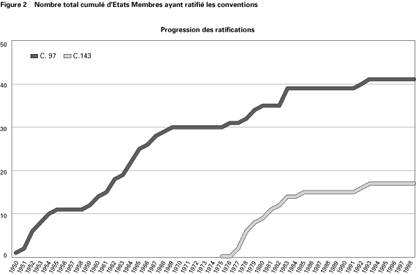 25. La convention no 97 est entrée en vigueur le 22 janvier 1952 et a été ratifiée, à la date du 11 décembre 1998, par 41 Etats Membres; la convention no 143 est entrée en vigueur le 9 décembre 1978 et a été ratifiée, à la date du 11 décembre 1998, par 18 Etats Membres(26). On peut observer dans les figures 2 et 3 ci-après l'évolution de la ratification de ces deux instruments.
