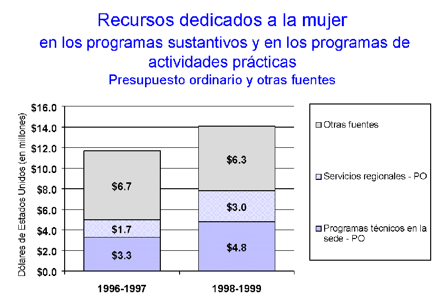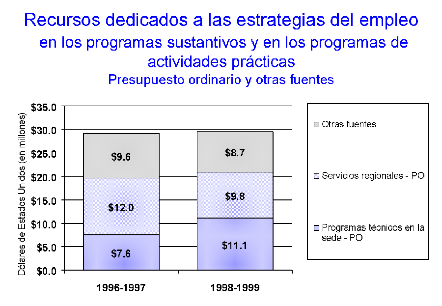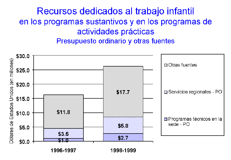 10. El aumento de los recursos que en el próximo bienio está previsto asignar dentro del presupuesto ordinario a los departamentos de la sede para el trabajo infantil supone un incremento de más de un 170 por ciento; para las estrategias de empleo, más de un 46 por ciento, y para las actividades en favor de la mujer, más de un 45 por ciento. El trabajo realizado en estos ámbitos por los departamentos regionales a partir de los recursos extrapresupuestarios, representa también un importante incremento de recursos.
