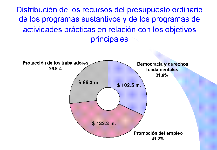 15. Muchos de ustedes han expresado el deseo de obtener indicaciones sobre la manera en que se articulan las propuestas de Programa y Presupuesto en relación con los grandes objetivos de la Organización, que acabo de recordar. La distribución de los recursos propuestos para los grandes programas técnicos de la sede y para los de las regiones en función de estos grandes objetivos, exige hacer ciertas opciones sobre la pertenencia de uno u otro programa a uno u otro de los objetivos principales. Estas opciones se han hecho con objetividad, sin que esto les confiera un carácter científico. El objetivo de la promoción del empleo y la lucha contra la pobreza representa un 41 por ciento de los recursos del presupuesto ordinario asignados a los programas sustantivos y a los programas de actividades prácticas. El apoyo a la democracia y a los derechos de los trabajadores recibe una asignación cercana al 32 por ciento de estos recursos. Finalmente, las propuestas destinadas a la protección de los trabajadores representan cerca de un 27 por ciento de ese total. (Véase el diagrama 4.)