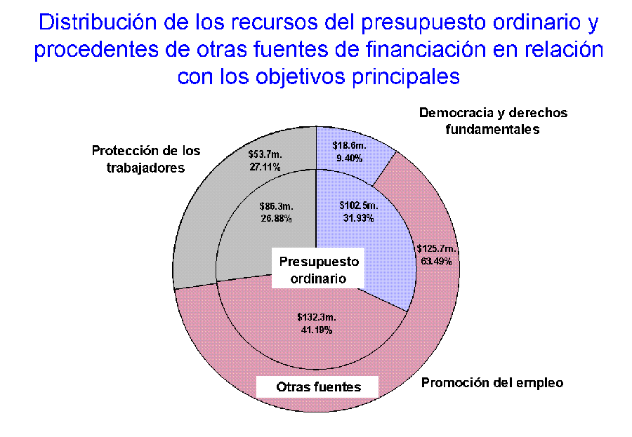 16. La superposición gráfica de las propuestas de presupuesto ordinario y de los recursos extrapresupuestarios esperados facilita la comparación de los grande objetivos a los que han sido asignados estos recursos. La gran mayoría de los recursos extrapresupuestarios, es decir un 63,5 por ciento, se asigna a unas actividades que contribuyen al gran objetivo del empleo y de la lucha contra la pobreza. El apoyo a la democracia recibe no menos de un 9,5 por ciento de los recursos extrapresupuestarios, mientras que el objetivo principal de la protección de los trabajadores recoge un porcentaje comparable de recursos extrapresupuestarios y de recursos con cargo al presupuesto ordinario. Esta comparación permite unas interpretaciones muy variadas. Simplemente, les recordaré que los recursos extrapresupuestarios están sobre todo en función de los problemas que se consideran prioritarios por parte de los mandantes en los Estados Miembros y que, por otra parte, son también el reflejo del interés y de la buena disposición de los donantes para facilitarles recursos. Me guardaré de hacer comentarios sobre estas comparaciones que, se lo recuerdo, tienen un valor meramente indicativo, pero tengo que observar que parece legítimo que la Oficina dedique cerca de un 32 por ciento de sus recursos con cargo al presupuesto ordinario de este sector a programas sustantivos y a programas de actividades prácticas, que tienen por objeto apoyar la democracia y fomentar el respeto de los derechos fundamentales de los trabajadores, puesto que éstos se sitúan en el corazón mismo de su mandato y que este objetivo parece obtener recursos extrapresupuestarios en una proporción netamente inferior. (Véase el diagrama 5.)