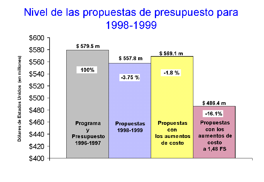 17. La evolución de los tipos de cambio del dólar me condujo a proponer unas reducciones de gastos para 1996-1997, de las que algunas fueron adoptadas por el Consejo de Administración en noviembre de 1995. En esa época, me comprometí también a que en mis propuestas de Programa y Presupuesto para 1998-1999 apareciese ya un nivel de reducción equivalente. (Véase el diagrama 6.)