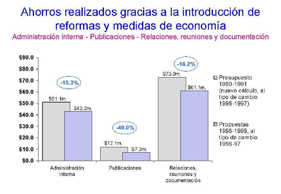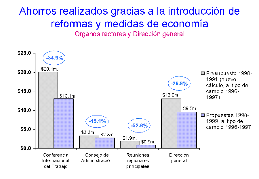 22. Las reformas para hacer que la Organización sea más eficiente no se detienen sino que se prosiguen con la mayor determinación. Así, acabo de decidir la aplicación generalizada de un Sistema de Seguimiento, Evaluación y Presentación de Informes (MERS), integrado en los procesos de planificación estratégica y de programación de la Oficina. Este sistema de gestión por objetivo, cuyas modalidades de implantación se están preparando en este momento, estará plenamente en vigor desde el bienio 1998-1999. Contribuirá incontestablemente a incrementar la transparencia de nuestras actividades. Se continuarán persiguiendo mejoras en la productividad y reducciones de costo por medio de la prosecución de la descentralización de las labores administrativas y financieras, así como por la explotación de las nuevas tecnologías. Las reformas introducidas han producido ya unos ahorros muy concretos, que se ilustran en forma de diagrama y que muestran los ahorros realizados en los distintos programas principales. La Conferencia Internacional del Trabajo que, en mis propuestas de Programa y Presupuesto recibe una asignación total de 13 millones de dólares, habría costado hoy más de 20 millones de dólares si no se hubiese empezado ha introducir reformas desde 1990-1991. Estableciendo la misma comparación para los costos de la administración interna, vemos que se ha llevado a cabo un ahorro de cerca de 7.800.000 dólares en relación con la situación existente en 1990-1991. (Véanse los diagramas 7 y 8.)