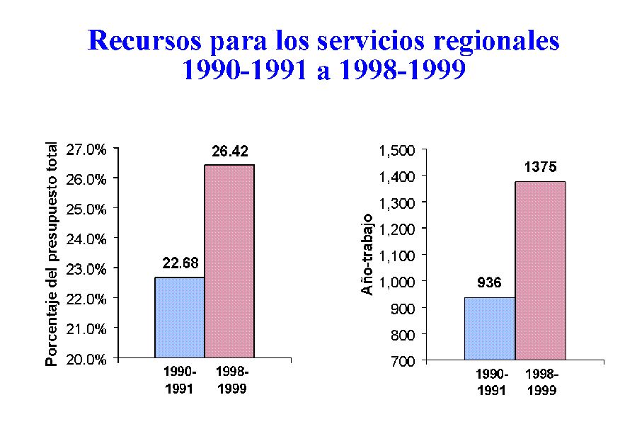 14. Hace ya varios bienios que la parte del presupuesto dedicada a las regiones está en constante aumento, y lo mismo se diga del próximo bienio. Su cuota en el presupuesto ordinario ha aumentado en un 1,78 por ciento (en términos reales) en 1996-1997 con relación a 1994-1995, y las propuestas para 1998-1999 suponen un incremento de un 1,20 por ciento (siempre en términos reales) en relación con el bienio 1996-1997. Con excepción de los servicios regionales, que se benefician de un aumento de recursos, todos los demás grandes sectores sufren unas reducciones que en algunos casos son importantes, como ocurre con los órganos rectores y las actividades de servicio y apoyo. Se observa también que los programas sustantivos y los programas de actividades prácticas tienen una cuota de presupuesto mayor en relación con la de estos mismos sectores en 1996-1997. Conviene tener en cuenta que las propuestas de Programa y Presupuesto para 1998-1999 cuentan con 21.700.000 dólares menos que el presupuesto aprobado para 1996-1997(Véase el diagrama 9.) .
