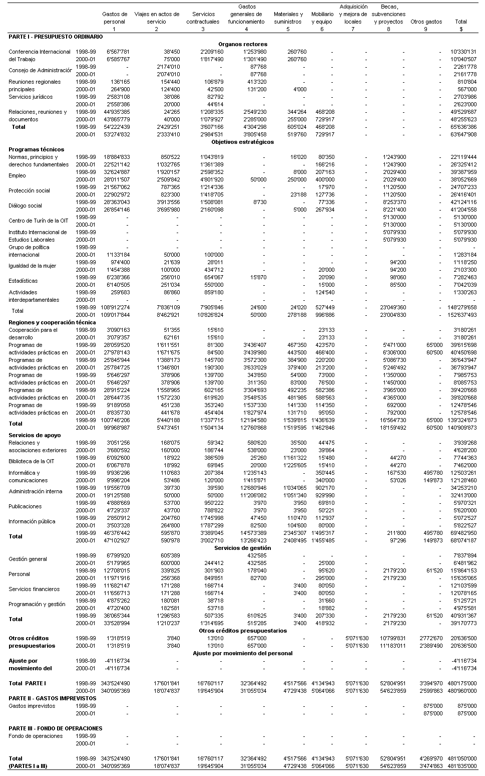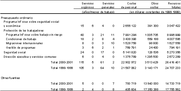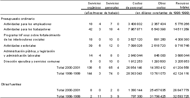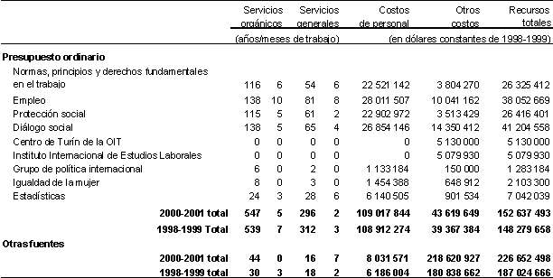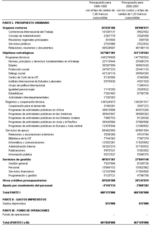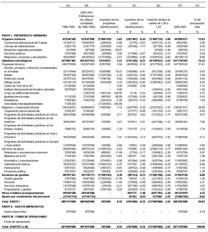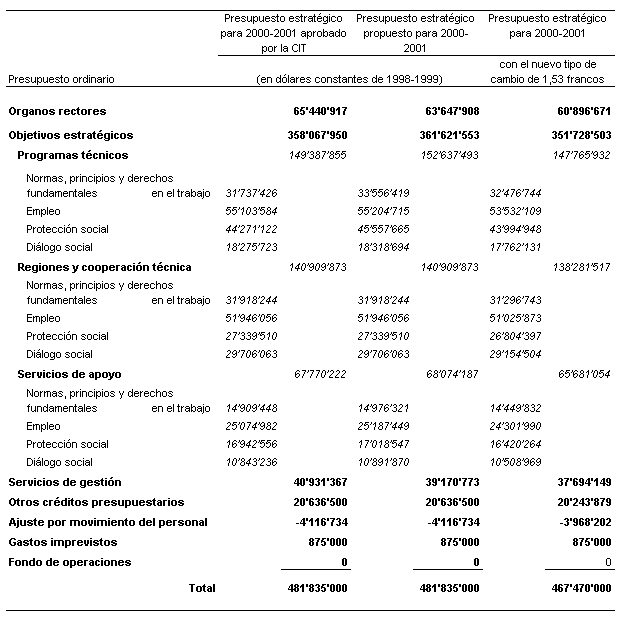 14. El cuadro 1 es el presupuesto estratégico adoptado por el Consejo de Administración y la Conferencia Internacional del Trabajo, actualizado para mostrar los efectos de la evolución de los tipos de cambio y de los costos en 2000-2001.