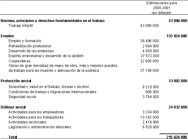 131. En su examen de las propuestas de Programa y Presupuesto para 2000-2001, en marzo de 1999, el Consejo de Administración pidió información sobre lo que aporta la cooperación técnica a los objetivos estratégicos. Las conclusiones sobre el cometido de la OIT en la cooperación técnica, adoptadas por la Conferencia Internacional del Trabajo en junio, remiten a la Declaración de la OIT relativa a los principios y derechos fundamentales en el trabajo y a los objetivos estratégicos como marco de programación para la cooperación técnica. Se logrará esto progresivamente. Surgieron dificultades por no haber sido negociados los proyectos en curso antes de la aprobación de los objetivos, y los de los proyectos se rigen inevitablemente por las prioridades de los demandantes y los destinatarios, además de las de la OIT. A pesar de esas limitaciones, a partir de los proyectos aprobados o en curso de negociación cabe prever el nivel de la cooperación técnica extrapresupuestaria para 2000-2001, que puede encajar en cada objetivo estratégico. Como lo indica el cuadro siguiente, cuyas cifras son estimaciones y no tienen en cuenta los resultados posibles de la movilización de recursos después de los debates de la Conferencia de este año, en particular para el seguimiento de la Declaración.