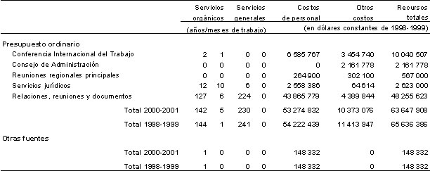 133. Los recursos disponibles para los órganos rectores se han reducido en 1.988.478 dólares, o sea, en un 3 por ciento, en comparación con 1988-1999. En el párrafo 17 anterior se ha explicado la disminución de unos 290.000 dólares en el caso de la Conferencia Internacional del Trabajo. La experiencia reciente pone de manifiesto la posibilidad de ahorrar 100.000 dólares en el del Consejo de Administración, ya que ciertos miembros no pueden asistir a todas las sesiones. Es posible reducir en 244.000 dólares la partida correspondiente a las reuniones regionales principales, como la próxima Reunión Regional Europea, que se celebrará en Ginebra, lo cual resulta menos oneroso que organizar reuniones fuera de Ginebra. Las reducciones de unos 81.000 y 1.274.000 dólares en la partida de los servicios jurídicos y en la de los servicios de relaciones, reuniones y documentos se deben a un mayor rendimiento.