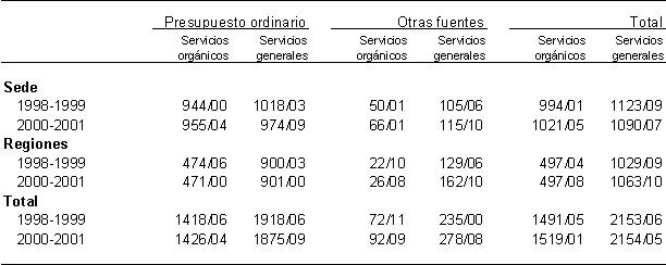 165. Comparando la totalidad del personal, con arreglo a todas las fuentes de financiación, en 1998-1999 y en 2000-2001, se observa un aumento de 27/08 años de trabajo para el personal de servicios orgánicos y de 0/11 para el de servicios generales en 2000-2001. Las proporciones de esos totales correspondientes a la sede y a las regiones no son las mismas. En las regiones hay un aumento global de 0/04 en el caso de los servicios orgánicos y de 34/01 en el de los servicios generales, mientras que en la sede aumentan en 27/04 los años de trabajo de los servicios orgánicos y menguan en 33/02 los de los servicios generales. Esta reducción puede solventarse con la jubilación normal, la merma natural y traslados internos. A causa de los efectos de la formulación estratégica del presupuesto, será menester realzar la capacidad y la competencia en ciertos sectores. El hecho de insistir más en los resultados que en los esfuerzos repercutirá en los métodos de trabajo. Por la importancia que se da a la labor de propugnación, hará falta un alto nivel de competencia personal en las comunicaciones internas y externas. Se renueva el hincapié en la cooperación técnica. Resultará más complejo dosificar las actividades entre la sede y las regiones cuando una y otras estén ligadas por unas metas y objetivos comunes. Todo ello obligará a dar al personal la oportunidad de mejorar sus calificaciones y de adquirir otras nuevas. De ahí la importancia de la estrategia de la Oficina en materia de recursos humanos (sobre la cual se presenta un documento al Consejo de Administración en esta reunión) para el éxito de esos nuevos modos de enfocar la gestión en la OIT.